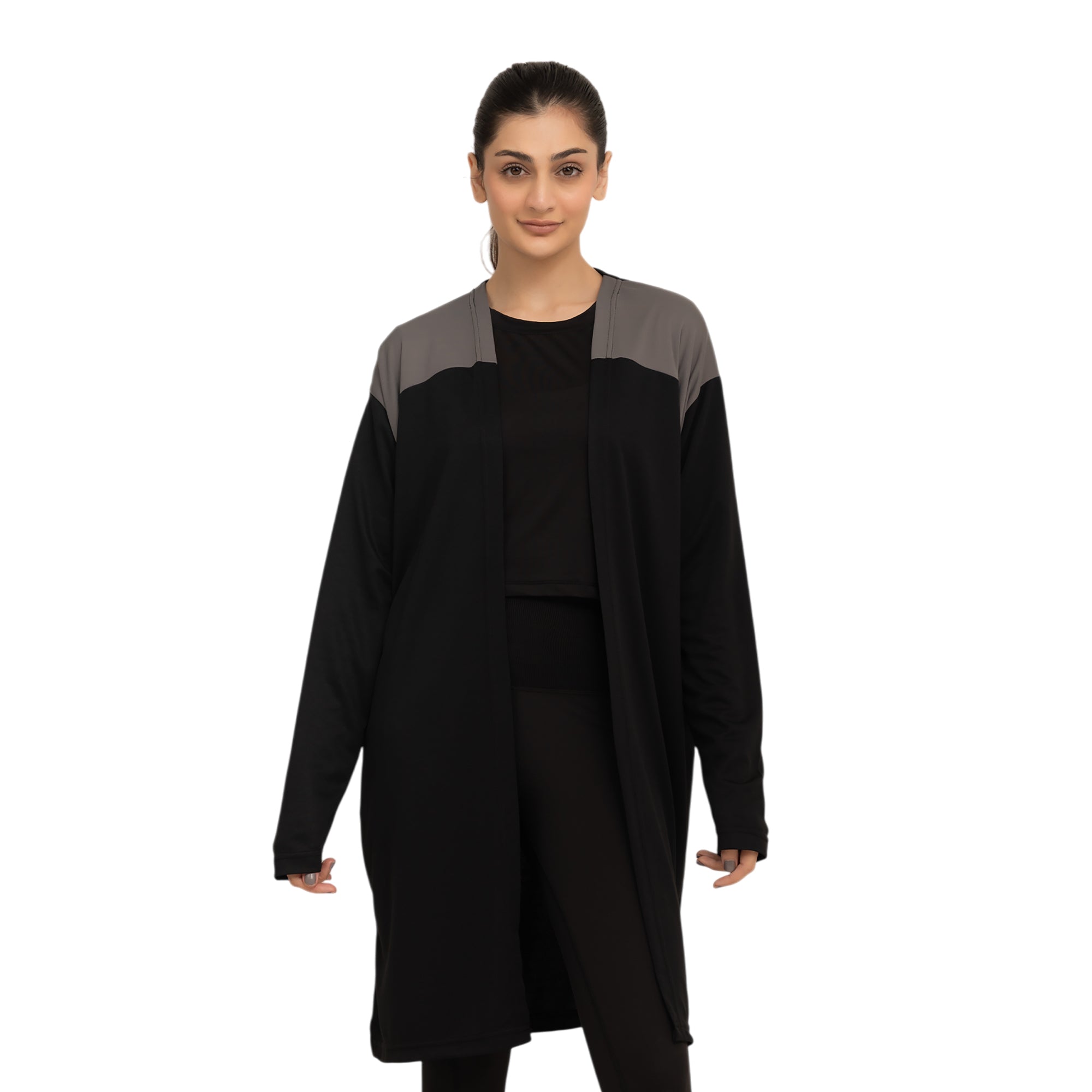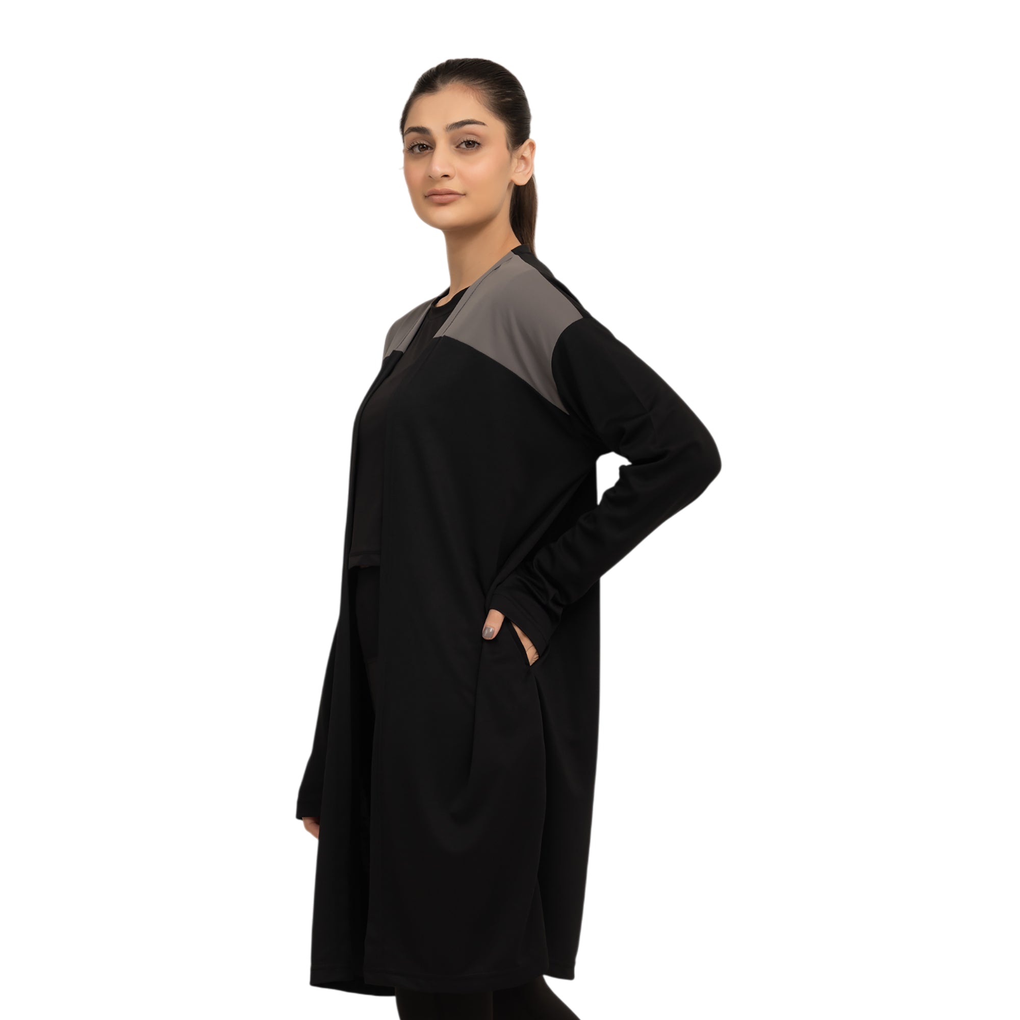 With a front-open cutline, dropped shoulders and full sleeves, this cape offers a relaxed yet polished silhouette. The mid-length design provides comfortable coverage, while bold color-block options add a modern, statement finish. Easy to throw on and easy to style, the Clyde Cape moves seamlessly from workouts to errands, travel or casual outings - making it the perfect cover-up for women who like their modest wear to feel confident, contemporary and intentional.
