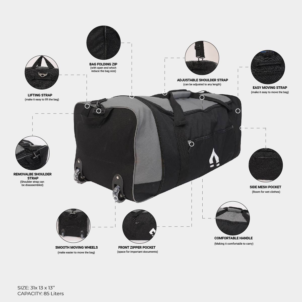 * Extra soft handle to roll the bag with smooth wheel movement.